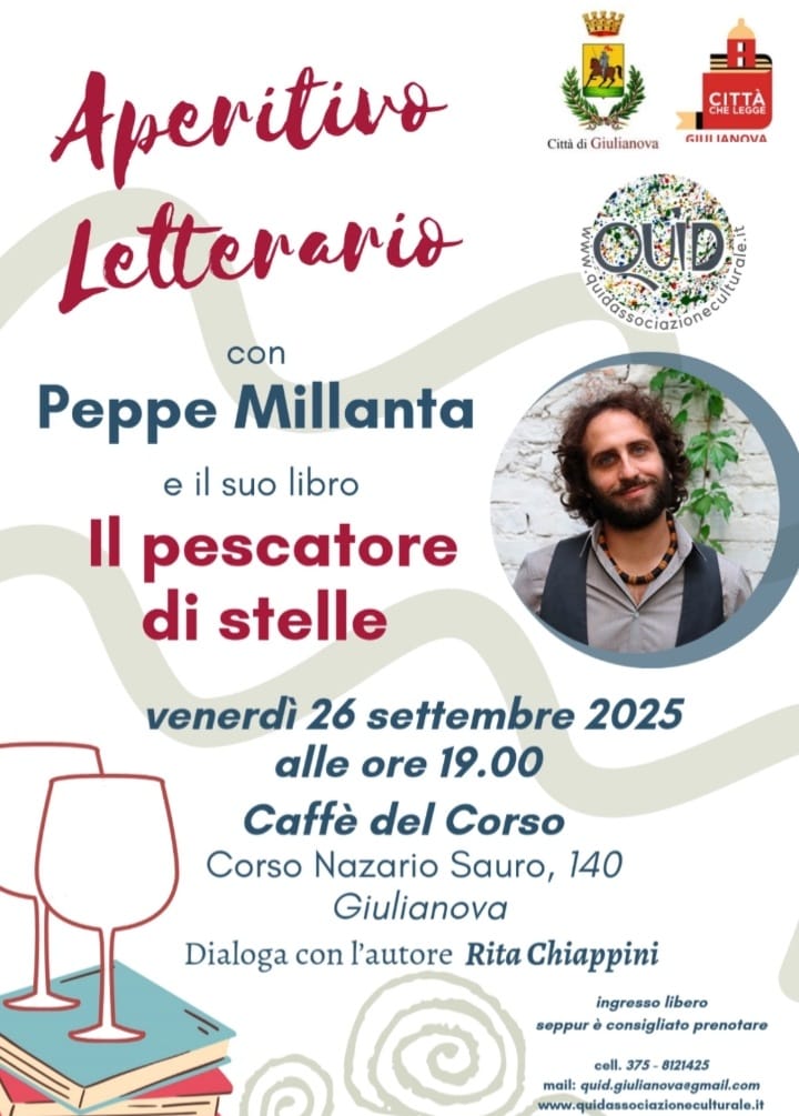 GIULIANOVA – «Il pescatore di stelle» (Rizzoli) di Peppe Millanta sarà protagonista di un aperitivo letterario previsto per venerdì 26 settembre alle ore 19 al Caffè del Corso di Giulianova grazie all’Associazione Culturale Quid. Dialoga con l’autore Rita Chiappini.
