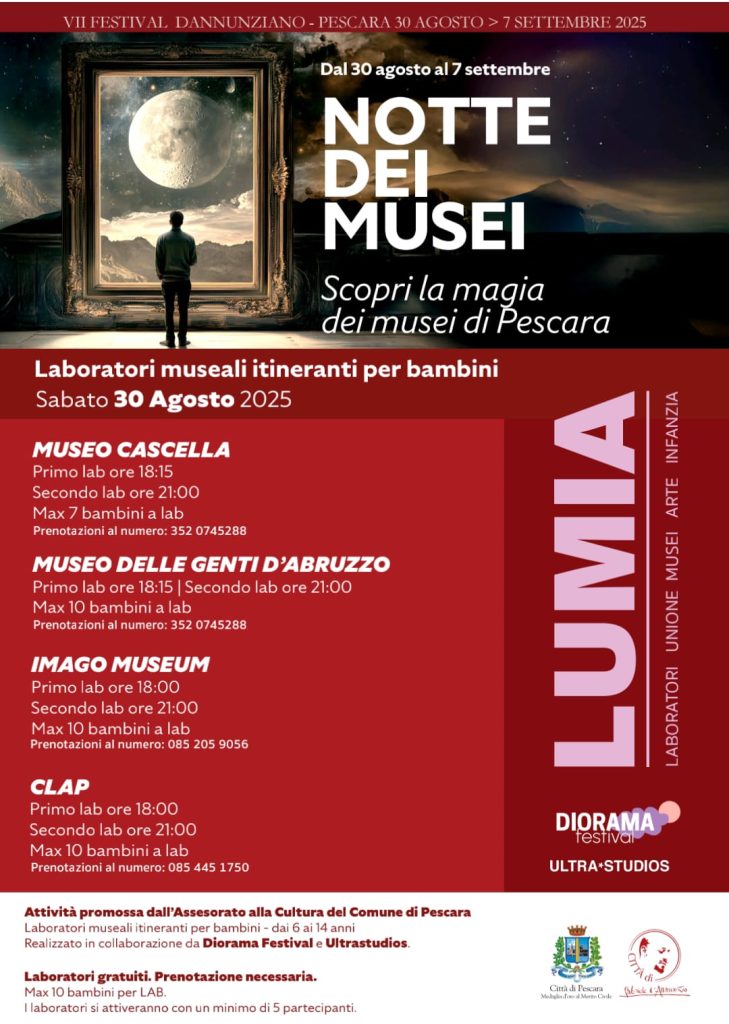 PESCARA – Domani a Pescara i musei resteranno aperti per l’intera serata, con laboratori per bambini e ragazzi, visite guidate al centro storico. Sono gli ingredienti della Notte dei Musei, una delle iniziative organizzate in apertura del Festival dannunziano e in programma domani a Pescara, con una serie di attività pensate e promosse dall’assessorato alla Cultura del Comune di Pescara, guidato dal vicesindaco Maria Rita Carota.