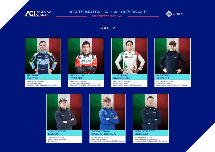Sette alfieri rappresenteranno la squadra ACI Team Italia nei rally. Due di loro hanno già ripreso il loro percorso nel Mondiale – FIA World Rally Championship all’interno della categoria WRC2. Dopo l’ottima stagione d’esordio lo scorso anno, impreziosita dalla vittoria nella gara di casa al Rally Italia Sardegna, il trentino Roberto Daprà (classe 2001) con Luca Guglielmetti ha già iniziato la nuova stagione con l’ottimo secondo posto al Rallye Monte-Carlo in apertura di campionato. Partenza lanciata anche per il trevigiano Giovanni Trentin (2007) che insieme a Pietro Ometto ha preso il via al Rally Sweden. Entrambi sfoggeranno il tricolore sulle Skoda Fabia RS Rally2 gestite dalla Delta Rally. Un’iniziativa importante per promuovere l’Italia in campo internazionale riguarda l’Europeo – FIA Europea Rally Championship, che vedrà protagonisti due piloti di ACI Team Italia sulle vetture Lancia gestite da F.P.F. Sport. Il bresciano vicecampione europeo Andrea Mabellini con Virginia Lenzi su Ypsilon HF Integrale Rally2 lotterà per il titolo nella categoria maggiore, mentre nel FIA Junior ERC il casertano Francesco Dei Ceci, vicecampione italiano Junior nel 2024, vivrà il suo secondo anno nella categoria due ruote motrici in coppia con Danilo Fappani sulla Ypsilon HF Rally4. Si è guadagnato un sedile nell’Europeo Junior anche Sebastian Dallapiccola, campione italiano Junior uscente che è pronto al debutto oltre i confini nazionali. Anche il giovane trentino sarà al volante di una Lancia Ypsilon HF Rally4, gestita in questo caso da Baldon Rally, affiancato dal navigatore Nicolò Lazzarini anche lui emerso dai programmi di formazione della Federazione.