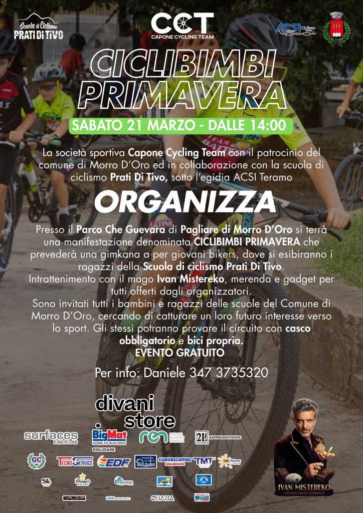 MORRO D’ORO – È tutto pronto per «Ciclibimbi Primavera», l’atteso appuntamento di ciclismo dedicato ai più piccoli, organizzato dalla Asd Capone Cycling Team con il patrocinio del Comune di Morro d’Oro e in collaborazione con ACSI Teramo, in programma domani, sabato 21 marzo a Pagliare di Morro d’Oro.