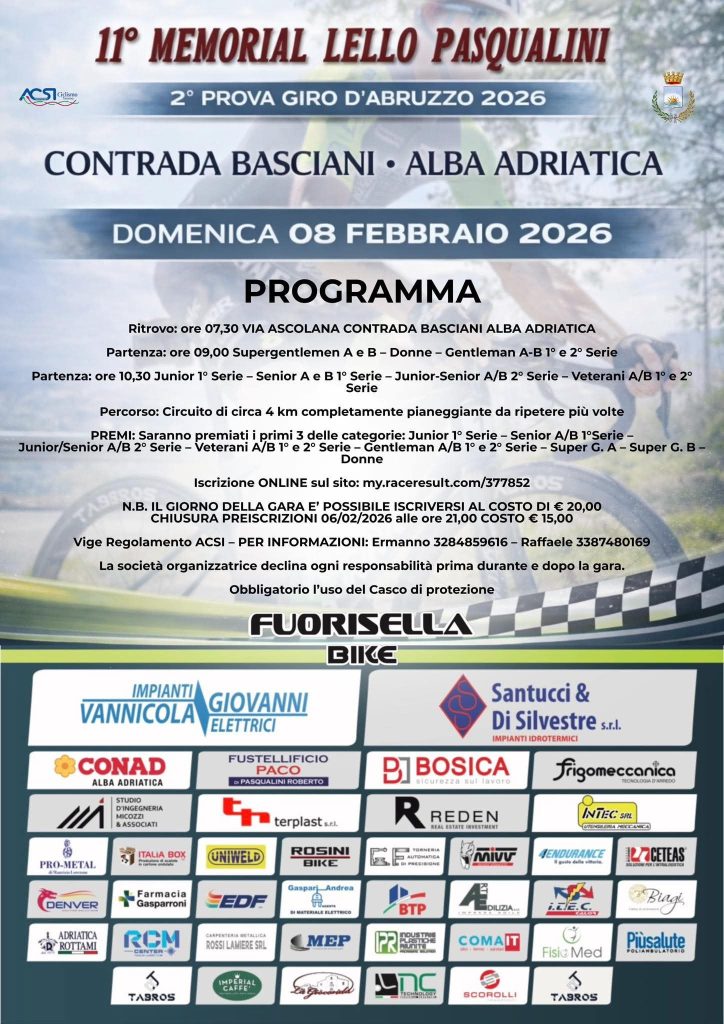 Come da tradizione, il «Memorial Lello Pasqualini» rappresenta uno degli eventi più attesi dell’inizio stagione per i cicloamatori abruzzesi e delle regioni vicine. Sotto l’egida dell’ACSI Ciclismo Teramo, la gara è valida come prova del Giro d’Abruzzo ACSI e si svolge su un circuito pianeggiante di quattro chilometri a Contrada Basciani. Il ritrovo è fissato alle 7:30 in via Ascolana, mentre la partenza ufficiale avverrà alle 9 in punto con la partenza della prima batteria riservata alle categorie gentlemen A-B di prima e seconda serie e supergentlemen A-B e donne. Intorno alle 10:30 prenderà il via la seconda batteria dedicata a junior prima serie, senior A-B prima serie, junior/senior A-B seconda serie e veterani A-B di prima e seconda serie. Il numero dei giri è in fase di definizione, mentre le premiazioni interesseranno i primi tre classificati di ogni categoria.