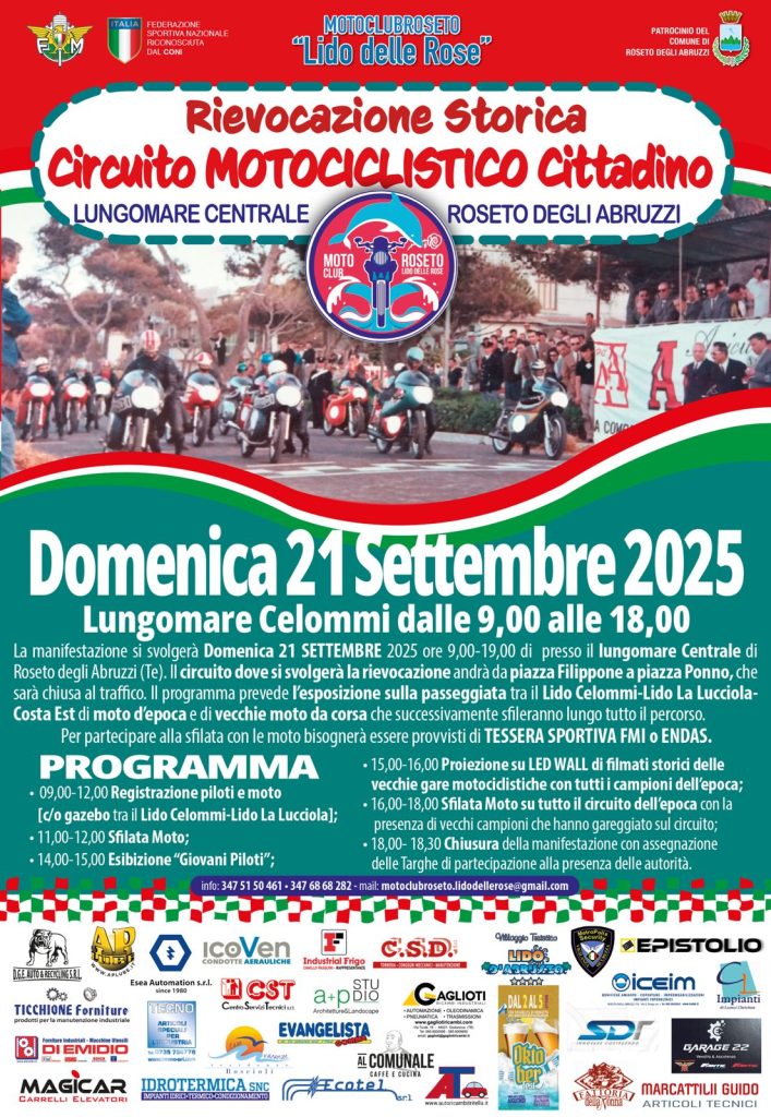 L’evento, promosso dal Moto Club Roseto «Lido delle Rose», con il sostegno della Federazione Italiana Motociclismo e dell’Amministrazione comunale rimette in «pista» vecchie glorie del passato e bolidi da corsa sul tratto di lungomare che si estende da Piazza Filippone Thaulero a Piazza Ponno, che per l’occasione sarà ovviamente chiuso al traffico.