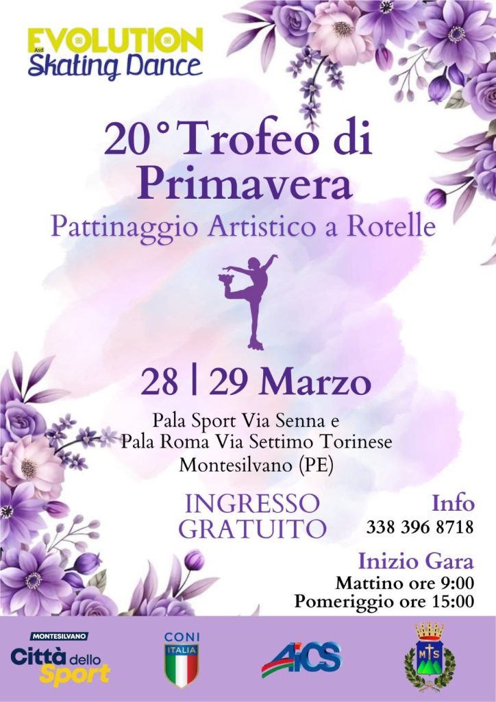 MONTESILVANO – Domani, sabato 28 e domenica 29 marzo Montesilvano ospita il Trofeo Primavera di pattinaggio artistico, manifestazione organizzata dall’Asd Evolution Skating Dance sotto l’egida AICS. L’evento di quest’anno, giunto alla sua 26esima edizione, si svolgerà in due diverse sedi: sabato al palazzetto di via Senna, domenica al Palaroma in via Settimo Torinese.