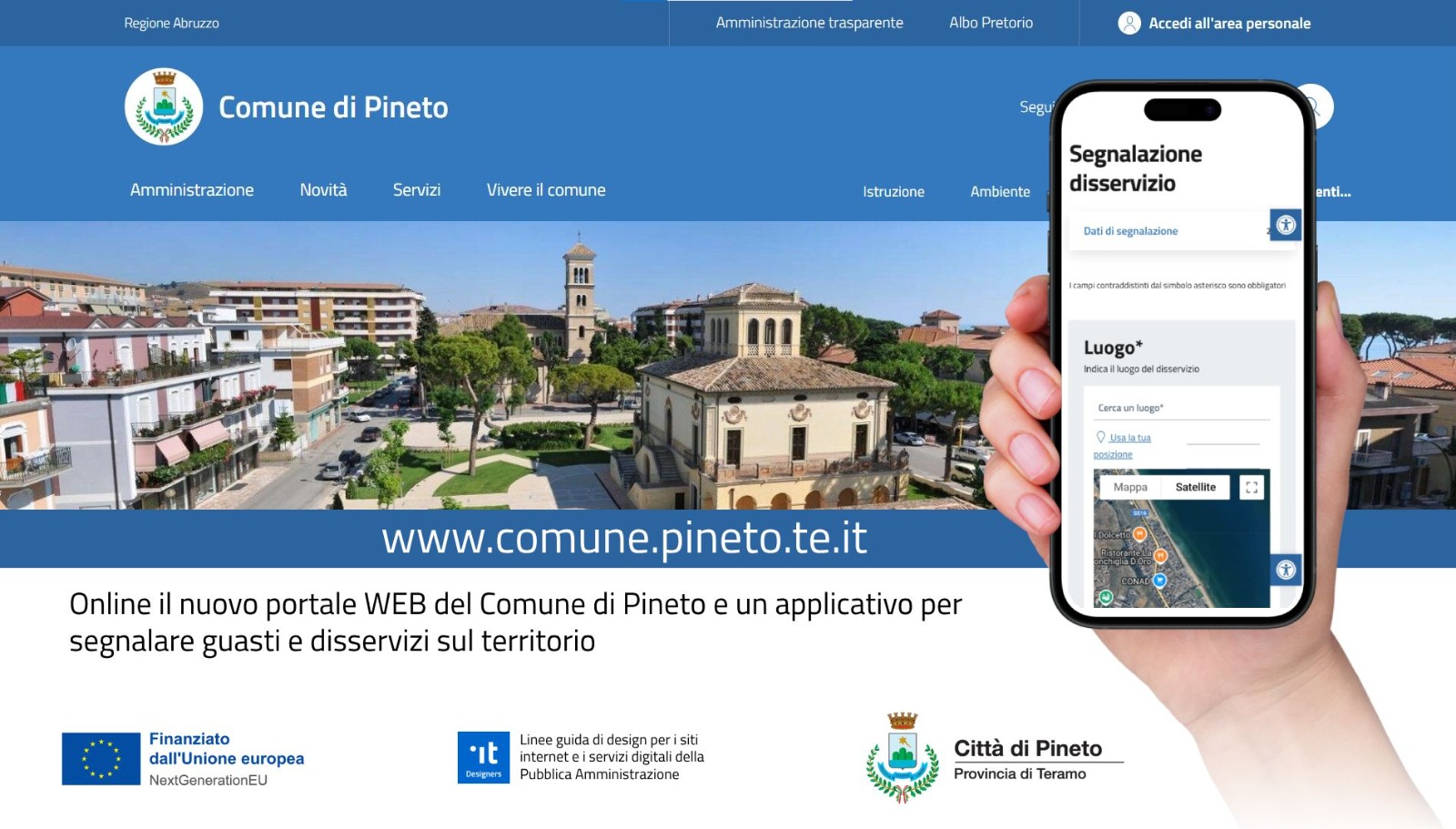 Ispirato ai principi dell’user centred design, il nuovo sito presenta un’interfaccia estremamente intuitiva e un’organizzazione dei contenuti chiara e accessibile anche a utenti con disabilità e con diverse competenze digitali, migliorando sensibilmente l’esperienza di navigazione del portale, che si candida così a diventare il principale punto d’accesso alle informazioni e ai servizi comunali, in coerenza con il principio «digital first». Inoltre è stata attivata una applicazione web – ovvero un modulo «responsive» che si adatta alla risoluzione di qualsiasi smartphone, pc o tablet – per la raccolta delle segnalazioni di guasti o disservizi su territorio e la completa gestione dell’intero iter di ripristino ed è accessibile dal seguente link: https://segnalazioni.comune.pineto.te.it/.