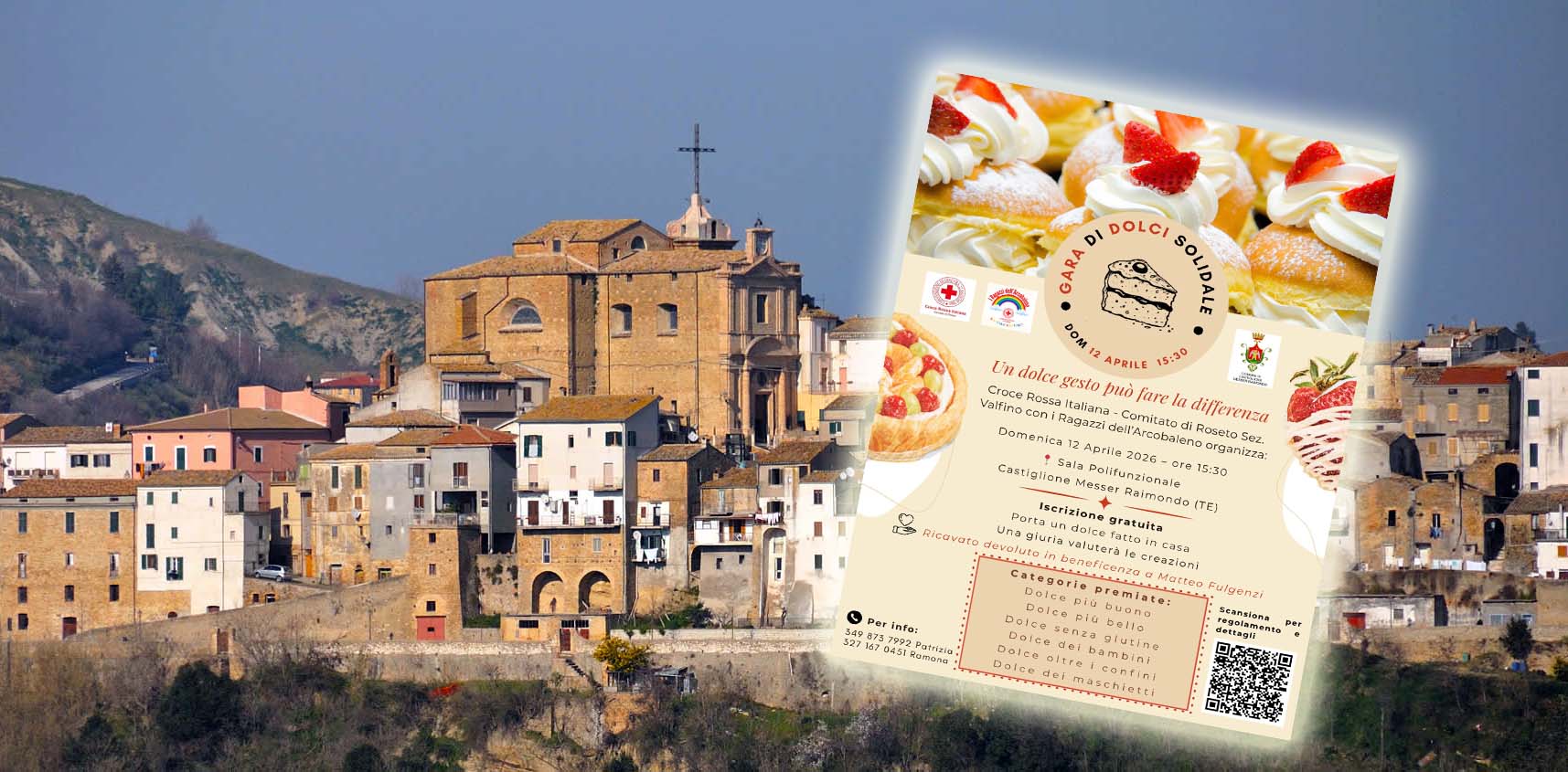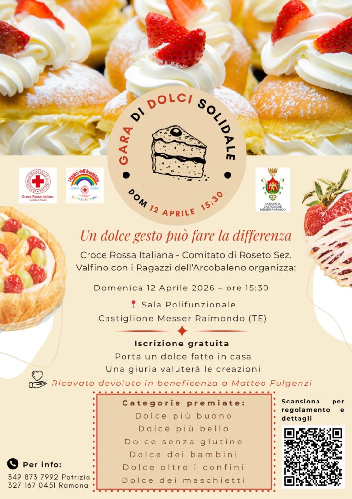 CASTIGLIONE MESSER RAIMONDO – Giornata solidale questo pomeriggio a Castiglione Messer Raimondo per la «Gara di Dolci», che prenderà il via alle 15:30, organizzata dalla Croce Rossa Italiana, del comitato di Roseto degli Abruzzi della sezione di Valfino, del presidente Giuliano Creati e dall’Associazione «Ragazzi dell’Arcobaleno».
