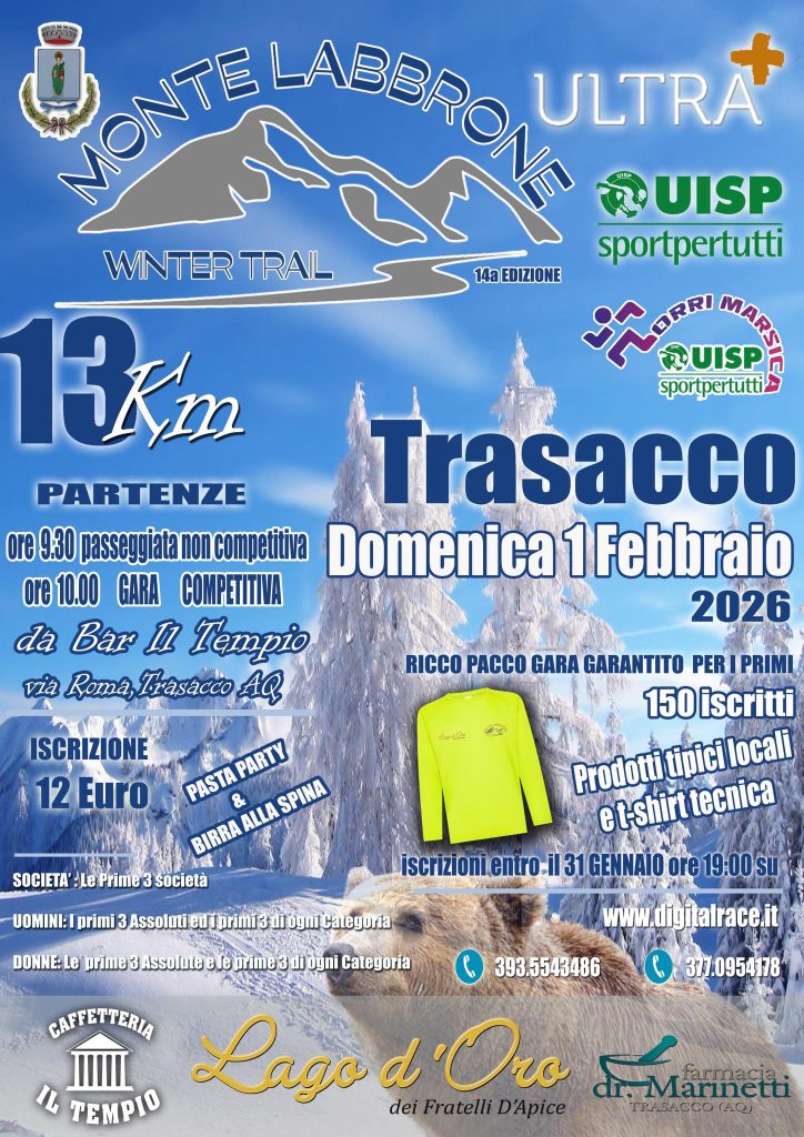 TRASACCO – Lo sport marsicano si prepara per la 14esima edizione della «Winter Trail del Monte Labbrone», in programma domenica primo febbraio a Trasacco, in provincia dell’Aquila. La manifestazione, curata dall’Asd Plus Ultra, si articolerà su un percorso di 13 chilometri e con con 400 metri di dislivello, alternando tratti veloci a passaggi più tecnici. In pratica la corsa campestre si svilupp per l’80% su sentieri sterrati, raggiungendo la quota dei 1.100 metri e con pendenze che sfiorano il 38% di pendenza.