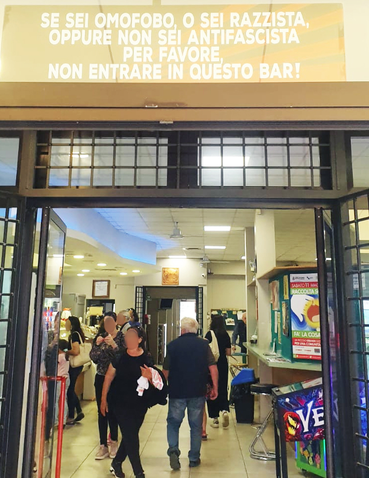 SAN LAZZARO DI SAVENA – Ci viene segnalata questa singolare oltre che ridicola scritta che campeggia sull’entrata di un bar a San Lazzaro di Savena, in provincia di Bologna, nella quale in modo molto esplicito, si vieta a tutti coloro che ancora non si siano dichiarati «antifascisti» di frequentare questo esercizio commerciale pubblico. Con la stessa intransigenza, si ricorda anche agli omofobi e ai razzisti di astenersi dal consumare bevande e quant’altro in questo locale.